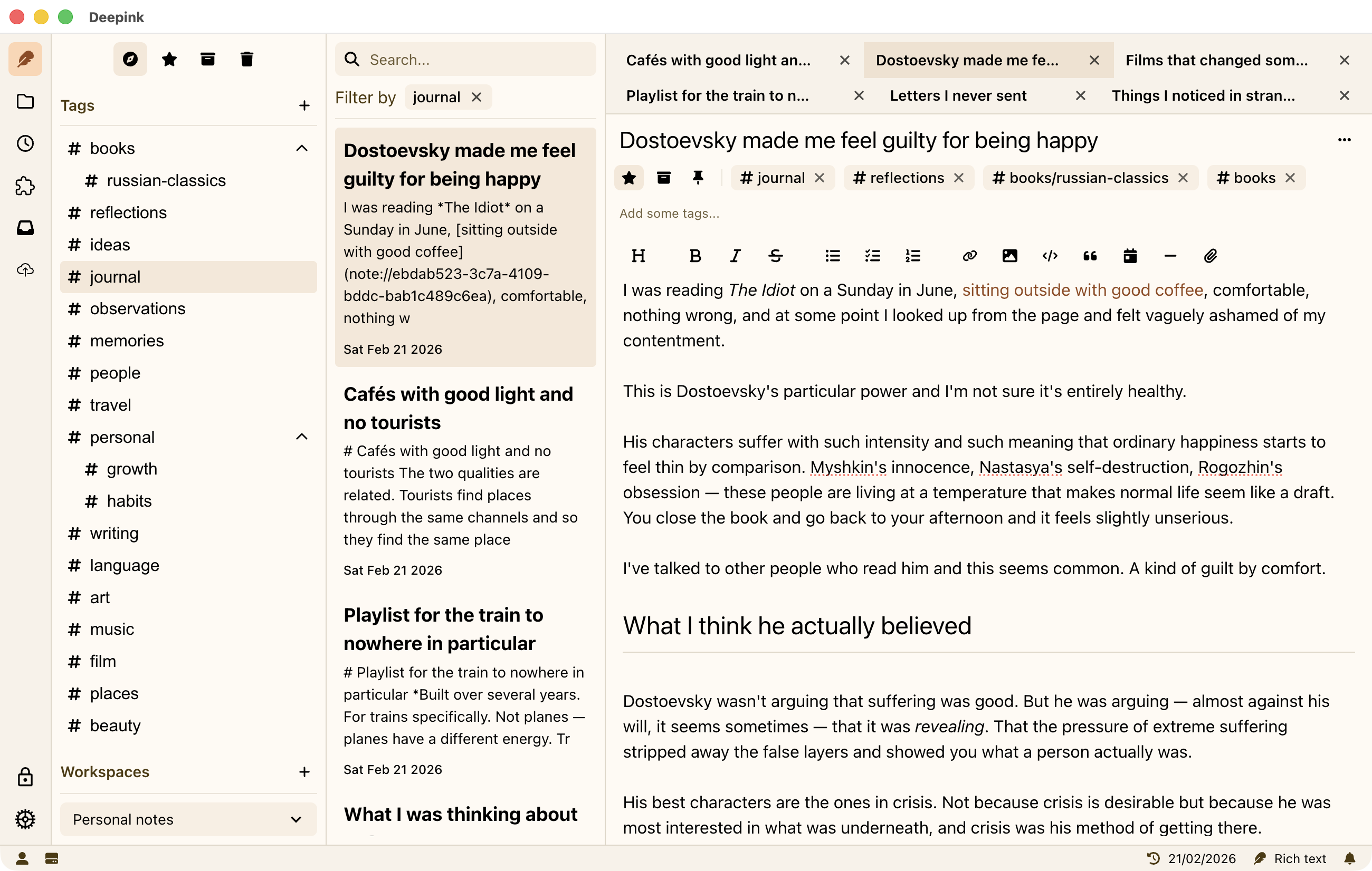 Keep everything in your vault. Workspaces and nested tags help you separate contexts and find what you need quickly, from project specs, contracts, and code snippets to book quotes, a daily journal, research, and more.