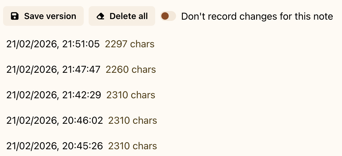 Each note keeps a complete history of changes. Deepink saves versions automatically, so you can see what changed, restore an earlier draft, or follow how an idea developed over time. Whether it was edited yesterday or a year ago, nothing important is lost. Previous versions are always available when you need them.