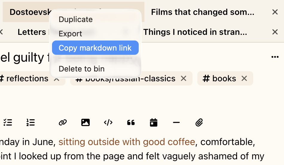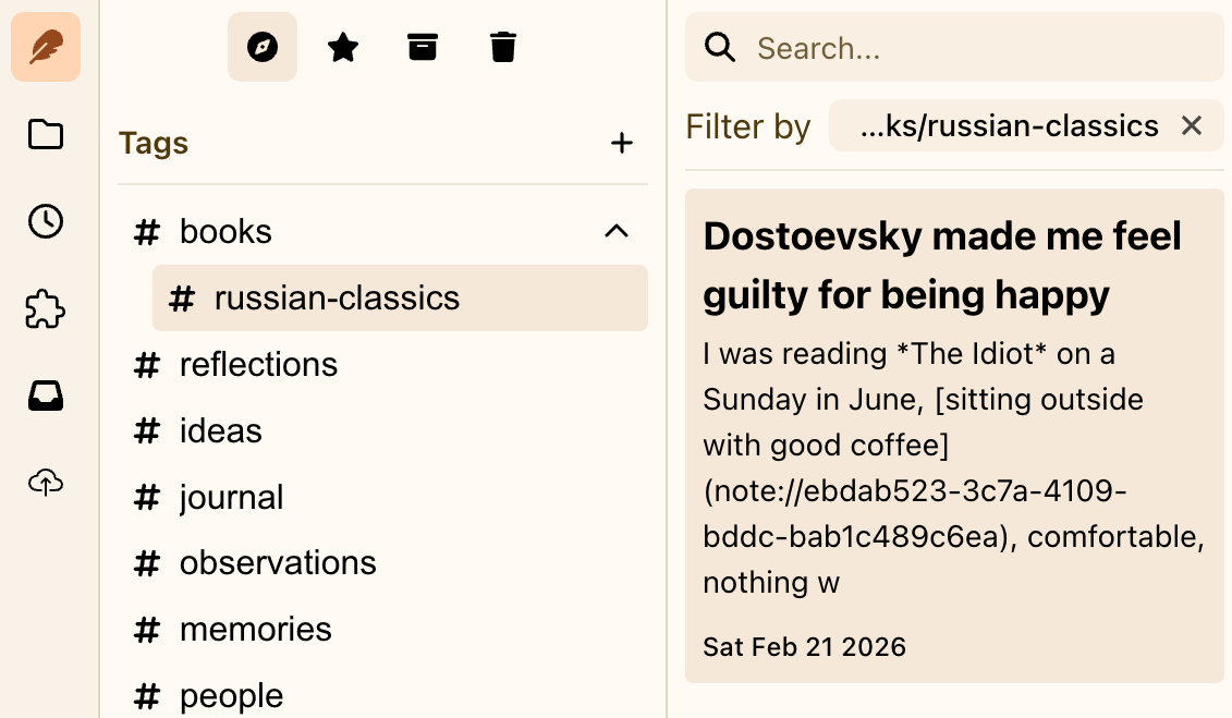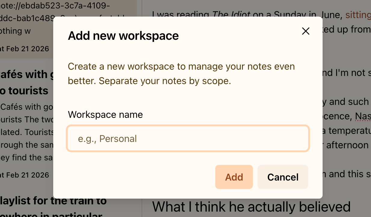 Keep everyday notes, reading, and plans in one private place. Switch contexts in a click, stay organized, and keep writing without breaking your flow.
